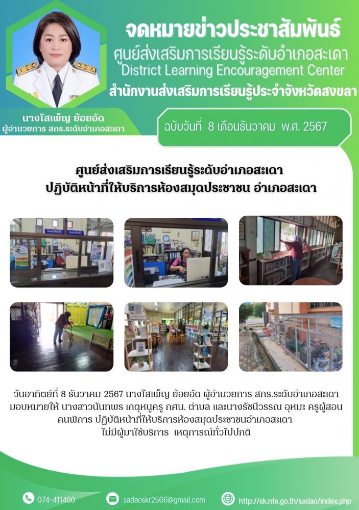 ศูนย์ส่งเสริมการเรียนรู้ระดับอำเภอสะเดา ปฏิบัติหน้าที่ให้บริการห้องสมุดประชาชน อำเภอสะเดา