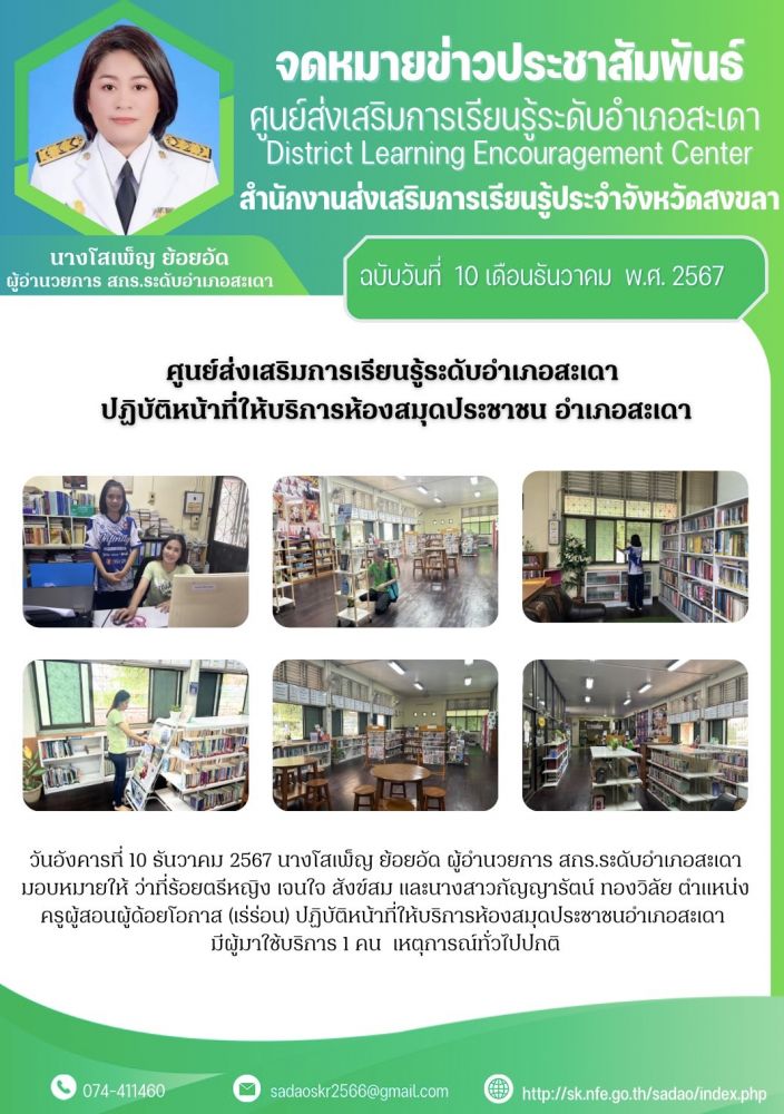 ศูนย์ส่งเสริมการเรียนรู้ระดับอำเภอสะเดา ปฏิบัติหน้าที่ให้บริการห้องสมุดประชาชน อำเภอสะเดา