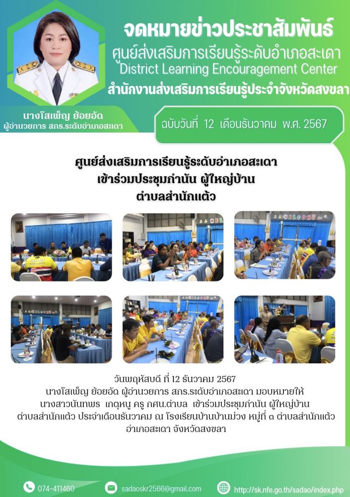 ศูนย์ส่งเสริมการเรียนรู้ระดับอำเภอสะเดา เข้าร่วมประชุมกำนัน ผู้ใหญ่บ้าน ตำบลสำนักแต้ว