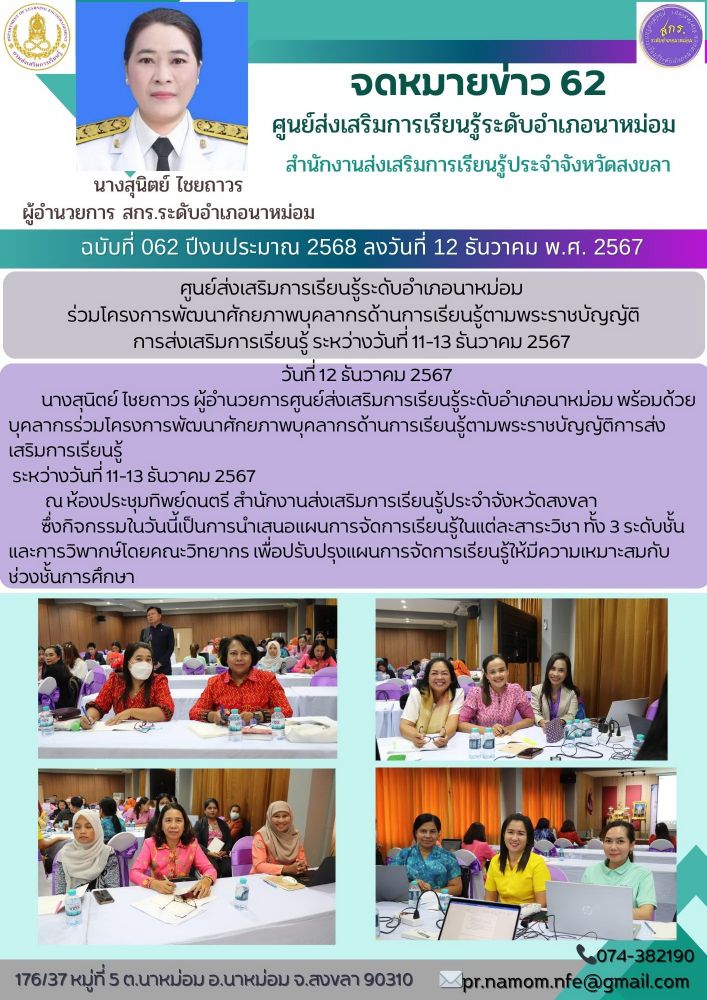 นางสุนิตย์ ไชยถาวร ผู้อำนวยการศูนย์ส่งเสริมการเรียนรู้ระดับอำเภอนาหม่อม พร้อมด้วยบุคลากร ร่วมโครงการพัฒนาศักยภาพบุคลากรด้านการเรียนรู้ตามพระราชบัญญัติการส่งเสริมการเรียนรู้ ระหว่างวันที่ 11-13 ธันวาคม 2567