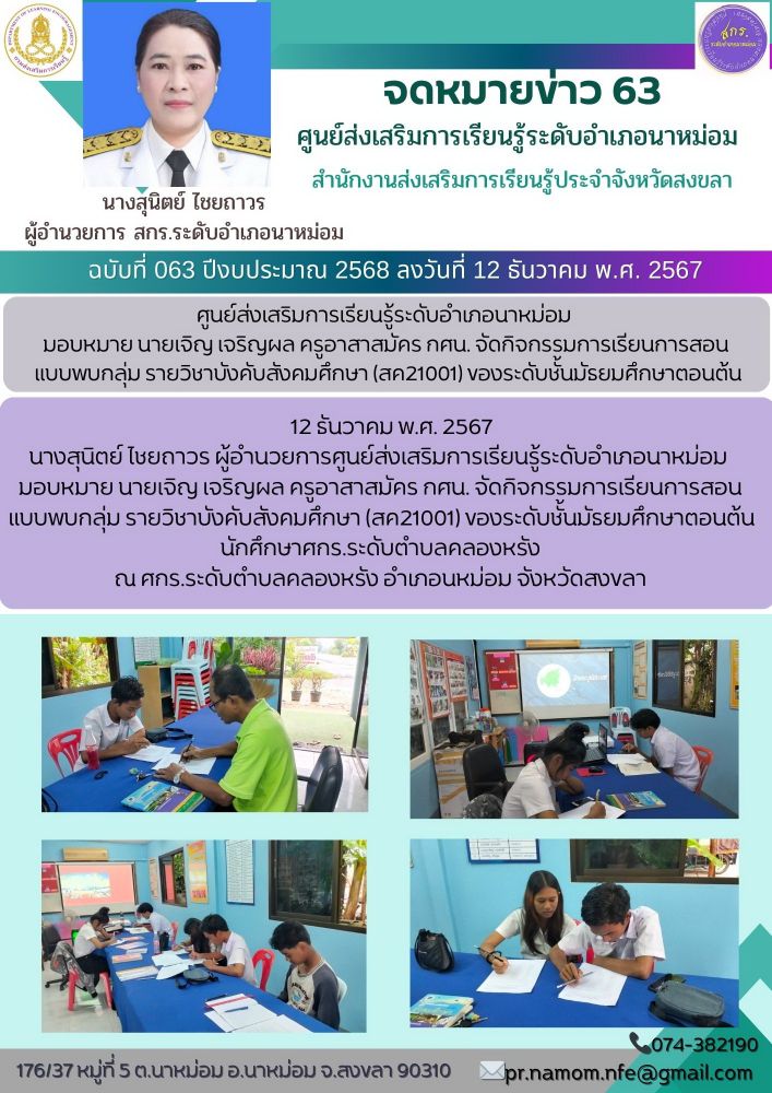 นางสุนิตย์ ไชยถาวร ผู้อำนวยการศูนย์ส่งเสริมการเรียนรู้ระดับอำเภอนาหม่อม มอบหมาย นายเจิญ เจริญผล ครูอาสาสมัคร กศน. จัดกิจกรรมการเรียนการสอน แบบพบกลุ่ม รายวิชาบังคับสังคมศึกษา (สค21001) ของระดับชั้นมัธยมศึกษาตอนต้น นักศึกษาศกร.ระดับตำบลคลองหรัง