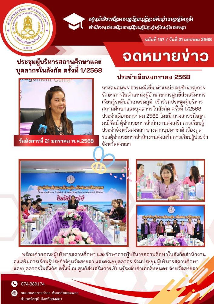 นางถนอมพร อารมณ์เย็น ตำแหน่ง ครูชำนาญการ รักษาการในตำแหน่งผู้อำนวยการศูนย์ส่งเสริมการเรียนรู้ระดับอำเภอรัตภูมิ เข้าร่วมประชุมผู้บริหารสถานศึกษาและบุคลากรในสังกัด ครั้งที่ 1/2568 ประจำเดือนมกราคม 2568 โดยมี นางสาวขนิษฐา มณีรัตน์ ผู้อำนวยการสำนักงานส่งเสริมการเรียนรู้ประจำจังหวัดสงขลา นางสาวบุปผาชาติ เรืองกูล รองผู้อำนวยการสำนักงานส่งเสริมการเรียนรู้ประจำจังหวัดสงขลา พร้อมด้วยคณะผู้บริหารสถานศึกษา และรักษาการผู้บริหารสถานศึกษาในสังกัดสำนักงานส่งเสริมการเรียนรู้ประจำจังหวัดสงขลา และคณะบุคลากร ร่วมประชุมผู้บริหารสถานศึกษาและบุคลากรในสังกัด ครั้งนี้ ณ ศูนย์ส่งเสริมการเรียนรู้ระดับอำเภอสิงหนคร จังหวัดสงขลา
