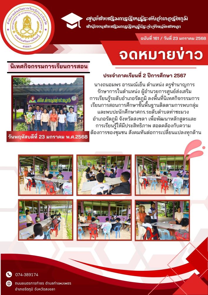 นางถนอมพร อารมณ์เย็น ตำแหน่ง ครูชำนาญการรักษาการในตำแหน่ง ผู้อำนวยการศูนย์ส่งเสริมการเรียนรู้ระดับอำเภอรัตภูมิ ลงพื้นที่นิเทศกิจกรรมการเรียนการสอนการศึกษาขั้นพื้นฐานติดตามการพบกลุ่มและพบปะนักศึกษาศกร.ระดับตำบลท่าชะมวง อำเภอรัตภูมิ จังหวัดสงขลา เพื่อพัฒนาหลักสูตรและ การเรียนรู้ให้มีประสิทธิภาพ สอดคล้องกับความ ต้องการของชุมชน สังคมทันต่อการเปลี่ยนแปลงทุกด้าน