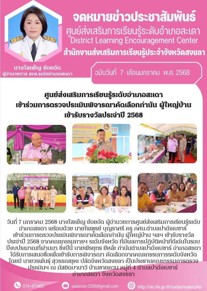 ศูนย์ส่งเสริมการเรียนรู้ระดับอำเภอสะเดา เข้าร่วมการตรวจประเมินพิจารณาคัดเลือกกำนัน ผู้ใหญ่บ้าน เข้ารับรางวัลประจำปี 2568