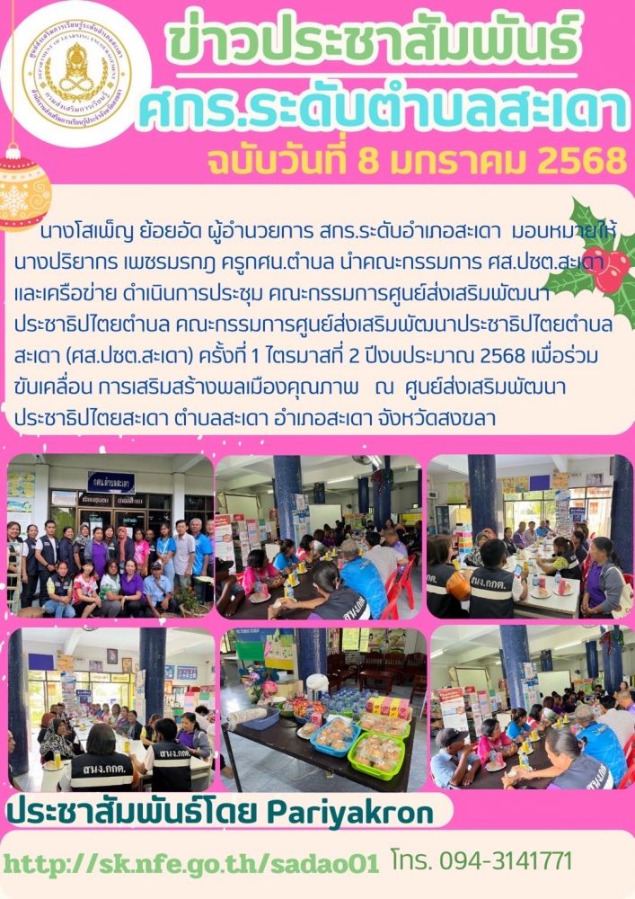 ศูนย์ส่งเสริมการเรียนรู้ระดับอำเภอสะเดา ดำเนินการประชุม คณะกรรมการศูนย์ส่งเสริมพัฒนา ประชาธิปไตยตำบล คณะกรรมการศูนย์ส่งเสริมพัฒนาประชาธิปไตยตำบล สะเดา (ศส.ปชต.สะเดา)