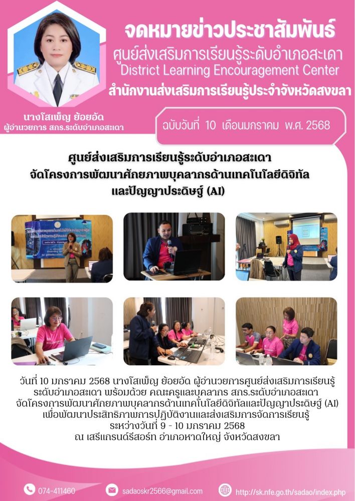 ศูนย์ส่งเสริมการเรียนรู้ระดับอำเภอสะเดา จัดโครงการพัฒนาศักยภาพบุคลากรด้านเทคโนโลยีดิจิทัล และปัญญาประดิษฐ์ (AI)