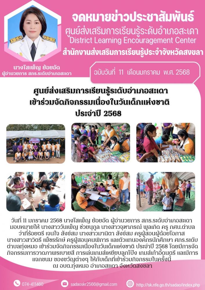 ศูนย์ส่งเสริมการเรียนรู้ระดับอำเภอสะเดา เข้าร่วมจัดกิจกรรมเนื่องในวันเด็กแห่งชาติ ประจำปี 2568