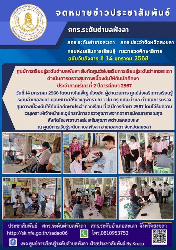 ศูนย์การเรียนรู้ระดับตำบลพังลา สังกัดศูนย์ส่งเสริมการเรียนรู้ระดับอำเภอสะเดา ดำเนินการตรวจสุขภาพเบื้องต้นให้กับนักศึกษา ประจําภาคเรียน ที่ 2 ปีการศึกษา 2567