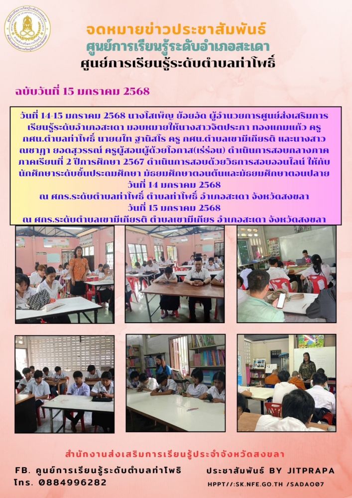 ศูนย์การเรียนรู้ระดับตำบลท่าโพธิ์ สังกัดศูนย์ส่งเสริมการเรียนรู้ระดับอำเภอสะเดา ดำาเนินการสอบกลางภาค ประจำภาคเรียน ที่ 2 ปีการศึกษา 2567