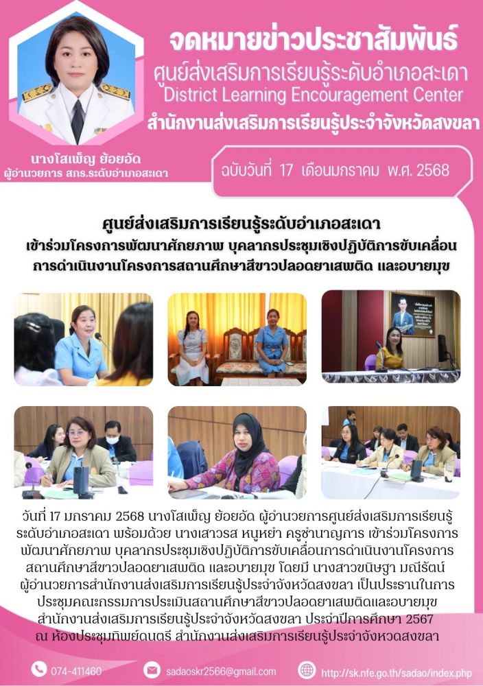 ศูนย์ส่งเสริมการเรียนรู้ระดับอำเภอสะเดา เข้าร่วมโครงการพัฒนาศักยภาพ บุคลากรประชุมเชิงปฏิบัติการขับเคลื่อน การดำเนินงานโครงการสถานศึกษาสีขาวปลอดยาเสพติด และอบายมุข