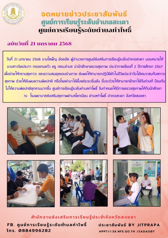 ศูนย์ส่งเสริมการเรียนรู้ระดับอำเภอสะเดา านักศึกษาตรวจสุขภาพ ประจํากาคเรียนที่ 2 ปีการศึกษา 2567