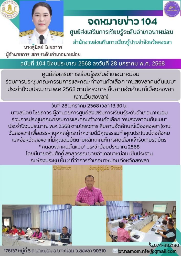 นางสุนิตย์ ไชยถาวร ผู้อำนวยการศูนย์ส่งเสริมการเรียนรู้ระดับอำเภอนาหม่อม ร่วมการประชุมคณะกรรมการและคณะทำงานคัดเลือก "คนสงขลาคนต้นแบบ" ประจำปีงบประมาณ พ.ศ.2568 ตามโครงการ สืบสานอัตลักษณ์เมืองสงขลา (งานวันสงขลา) เพื่อสรรหาบุคคลผู้กระทำความดีมีคุณธรรมทำคุณประโยชน์ต่อสังคมและจังหวัดสงขลาที่มีคุณสมบัติตามหลักเกณฑ์การคัดเลือกเข้ารับเกียรติบัตร" คนสงขลาคนต้นแบบ" ประจำปีงบประมาณ 2568