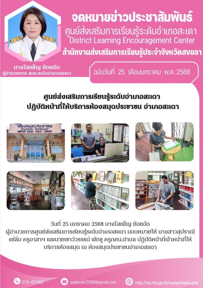ศูนย์ส่งเสริมการเรียนรู้ระดับอำเภอสะเดา ปฏิบัติหน้าที่ให้บริการห้องสมุดประชาชน อำเภอสะเดา