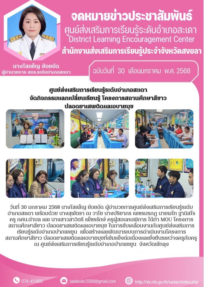 ศูนย์ส่งเสริมการเรียนรู้ระดับอำเภอสะเดา จัดกิจกรรมแลกเปลี่ยนเรียนรู้ โครงการสถานศึกษาสีขาว ปลอดยาเสพติดและอบายมุข