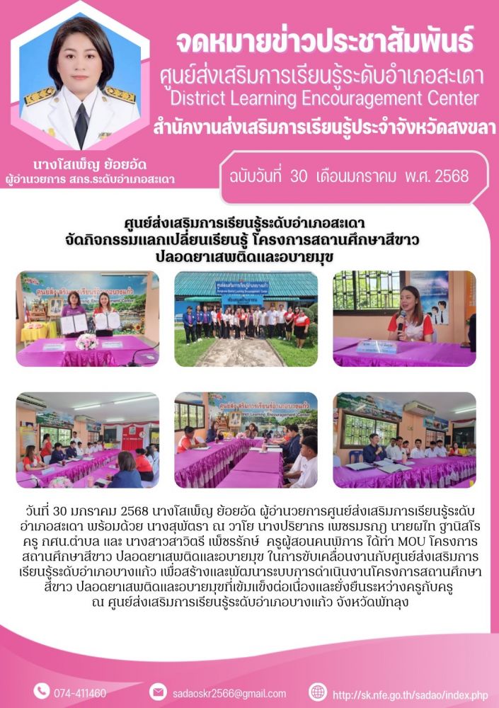ศูนย์ส่งเสริมการเรียนรู้ระดับอำเภอสะเดา จัดกิจกรรมแลกเปลี่ยนเรียนรู้ โครงการสถานศึกษาสีขาว ปลอดยาเสพติดและอบายมุข
