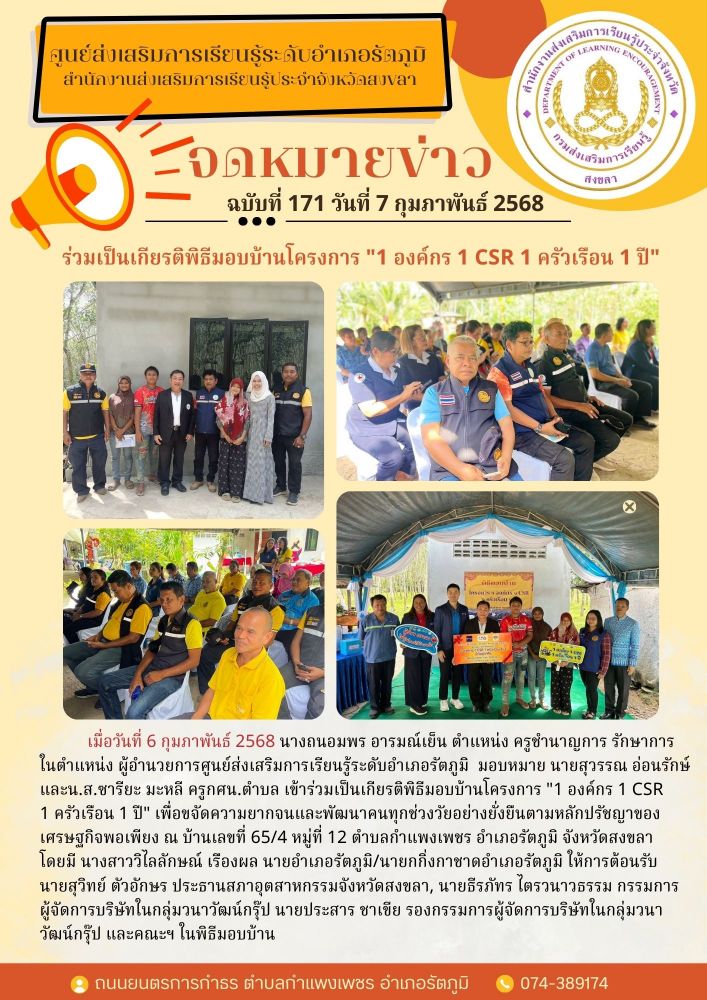 เมื่อวันที่ 6 กุมภาพันธ์ 2568 นางถนอมพร อารมณ์เย็น ตำแหน่ง ครูชำนาญการ รักษาการในตำแหน่ง ผู้อำนวยการศูนย์ส่งเสริมการเรียนรู้ระดับอำเภอรัตภูมิ มอบหมาย นายสุวรรณ อ่อนรักษ์ และน.ส.ซารียะ มะหลี ครูกศน.ตำบล เข้าร่วมเป็นเกียรติพิธีมอบบ้านโครงการ "1 องค์กร 1 CSR 1 ครัวเรือน 1 ปี" เพื่อขจัดความยากจนและพัฒนาคนทุกช่วงวัยอย่างยั่งยืนตามหลักปรัชญาของเศรษฐกิจพอเพียง ณ บ้านเลขที่ 65/4 หมู่ที่ 12 ตำบลกำแพงเพชร อำเภอรัตภูมิ จังหวัดสงขลา โดยมี นางสาววิไลลักษณ์ เรืองผล นายอำเภอรัตภูมิ/นายกกิ่งกาชาดอำเภอรัตภูมิ ให้การต้อนรับ นายสุวิทย์ ตัวอักษร ประธานสภาอุตสาหกรรมจังหวัดสงขลา, นายธีรภัทร ไตรวนาวธรรม กรรมการ ผู้จัดการบริษัทในกลุ่มวนาวัฒน์กรุ๊ป นายประสาร ชาเขีย รองกรรมการผู้จัดการบริษัทในกลุ่มวนาวัฒน์กรุ๊ป และคณะฯ ในพิธีมอบบ้าน