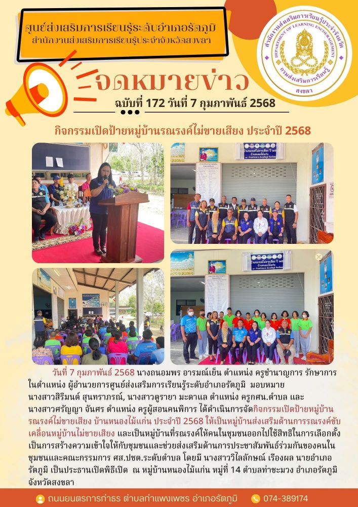 วันที่ 7 กุมภาพันธ์ 2568 นางถนอมพร อารมณ์เย็น ตำแหน่ง ครูชำนาญการ รักษาการในตำแหน่ง ผู้อำนวยการศูนย์ส่งเสริมการเรียนรู้ระดับอำเภอรัตภูมิ มอบหมาย นางสาวสิริมนต์ สุนทราภรณ์, นางสาวตูรายา มะดาแล ตำแหน่ง ครูกศน.ตำบล และนางสาวศรัญญา จันศร ตำแหน่ง ครูผู้สอนคนพิการ ได้ดำเนินการจัดกิจกรรมเปิดป้ายหมู่บ้านรณรงค์ไม่ขายเสียง บ้านหนองไม้แก่น ประจำปี 2568 ให้เป็นหมู่บ้านส่งเสริมด้านการรณรงค์ขับเคลื่อนหมู่บ้านไม่ขายเสียง และเป็นหมู่บ้านที่รณรงค์ให้คนในชุมชนออกไปใช้สิทธิในการเลือกตั้ง เป็นการสร้างความเข้าใจให้กับชุมชนและช่วยส่งเสริมด้านการประชาสัมพันธ์ร่วมกันของคนในชุมชนและคณะกรรมการ ศส.ปชต.ระดับตำบล โดยมี นางสาววิไลลักษณ์ เรืองผล นายอำเภอรัตภูมิ เป็นประธานเปิดพิธีเปิด ณ หมู่บ้านหนองไม้แก่น หมู่ที่ 14 ตำบลท่าชะมวง อำเภอรัตภูมิ จังหวัดสงขลา