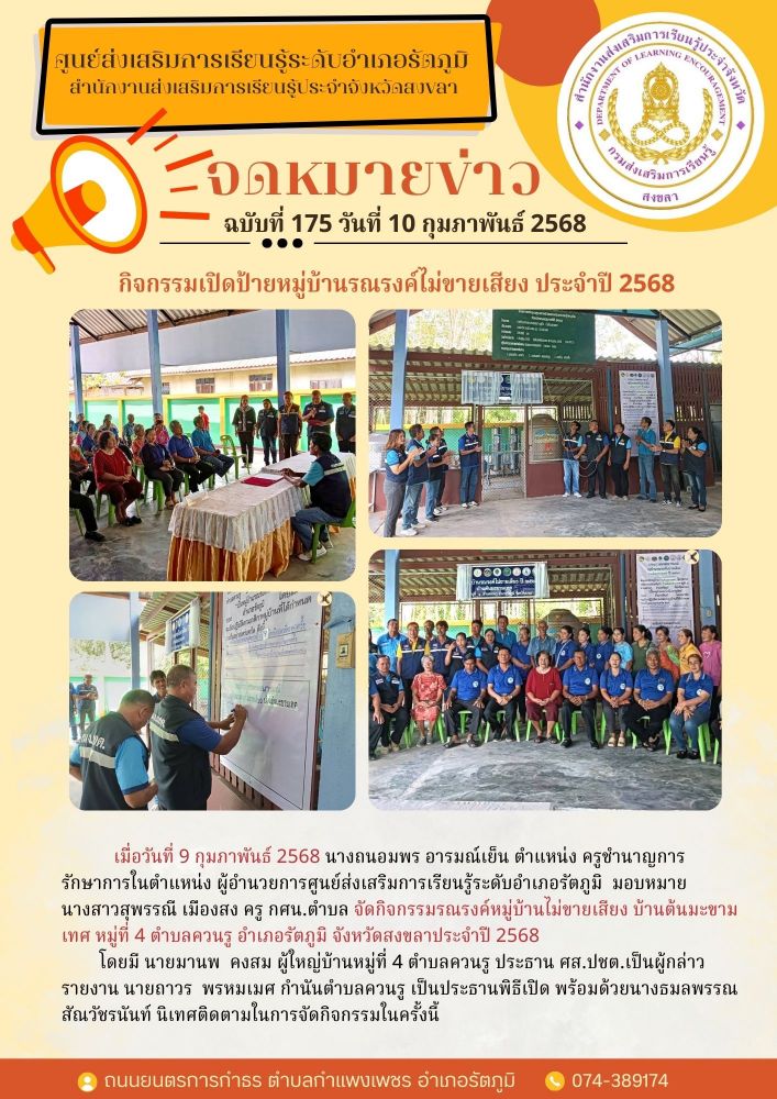 เมื่อวันที่ 9 กุมภาพันธ์ 2568 นางถนอมพร อารมณ์เย็น ตำแหน่ง ครูชำนาญการรักษาการในตำแหน่ง ผู้อำนวยการศูนย์ส่งเสริมการเรียนรู้ระดับอำเภอรัตภูมิ มอบหมาย นางสาวสุพรรณี เมืองสง ครู กศน.ตำบล จัดกิจกรรมรณรงค์หมู่บ้านไม่ขายเสียง บ้านต้นมะขามเทศ หมู่ที่ 4 ตำบลควนรู อำเภอรัตภูมิ จังหวัดสงขลาประจำปี 2568 โดยมี นายมานพ คงสม ผู้ใหญ่บ้านหมู่ที่ 4 ตำบลควนรู ประธาน ศส.ปชต.เป็นผู้กล่าวรายงาน นายถาวร พรหมเมศ กำนันตำบลควนรู เป็นประธานพิธีเปิด พร้อมด้วยนางธมลพรรณ สัณวัชรนันท์ นิเทศติดตามในการจัดกิจกรรมในครั้งนี้
