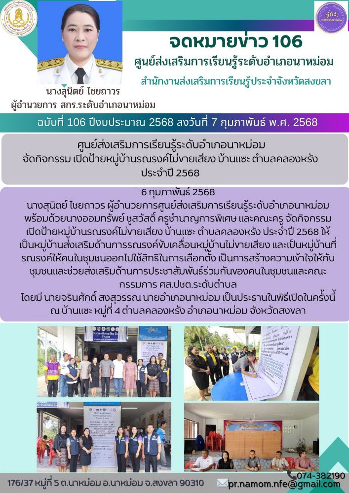 นางสุนิตย์ ไชยถาวร ผู้อำนวยการศูนย์ส่งเสริมการเรียนรู้ระดับอำเภอนาหม่อม พร้อมด้วยนางออมทรัพย์ ชูสวัสดิ์ ครูชำนาญการพิเศษ เเละคณะครู จัดกิจกรรม เปิดป้ายหมู่บ้านรณรงค์ไม่ขายเสียง บ้านเเซะ ตำบลคลองหรัง ประจำปี 2568 ให้เป็นหมู่บ้านส่งเสริมด้านการรณรงค์ขับเคลื่อนหมู่บ้านไม่ขายเสียง และเป็นหมู่บ้านที่รณรงค์ให้คนในชุมชนออกไปใช้สิทธิในการเลือกตั้ง เป็นการสร้างความเข้าใจให้กับชุมชนและช่วยส่งเสริมด้านการประชาสัมพันธ์ร่วมกันของคนในชุมชนและคณะกรรมการ ศส.ปชต.ระดับตำบล