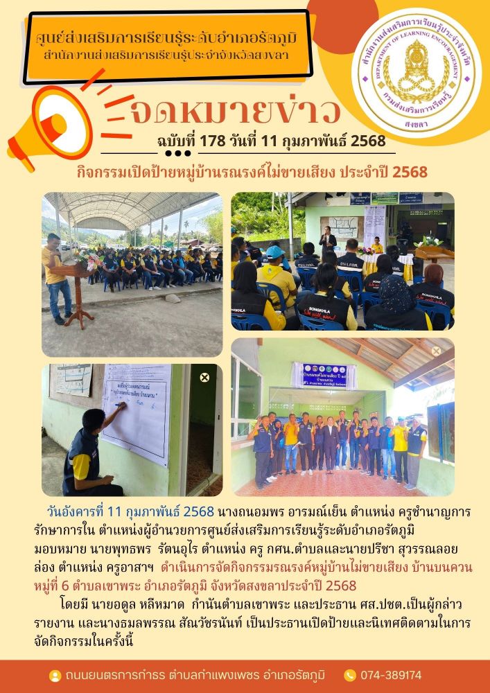 วันอังคารที่ 11 กุมภาพันธ์ 2568 นางถนอมพร อารมณ์เย็น ตำแหน่ง ครูชำนาญการ รักษาการใน ตำแหน่งผู้อำนวยการศูนย์ส่งเสริมการเรียนรู้ระดับอำเภอรัตภูมิ มอบหมาย นายพุทธพร รัตนอุไร ตำแหน่ง ครู กศน.ตำบลและนายปรีชา สุวรรณลอยล่อง ตำแหน่ง ครูอาสาฯ ดำเนินการจัดกิจกรรมรณรงค์หมู่บ้านไม่ขายเสียง บ้านบนควน หมู่ที่ 6 ตำบลเขาพระ อำเภอรัตภูมิ จังหวัดสงขลาประจำปี 2568 โดยมี นายอดูล หลีหมาด กำนันตำบลเขาพระ และประธาน ศส.ปชต.เป็นผู้กล่าวรายงาน และนางธมลพรรณ สัณวัชรนันท์ เป็นประธานเปิดป้ายและนิเทศติดตามในการจัดกิจกรรมในครั้งนี้