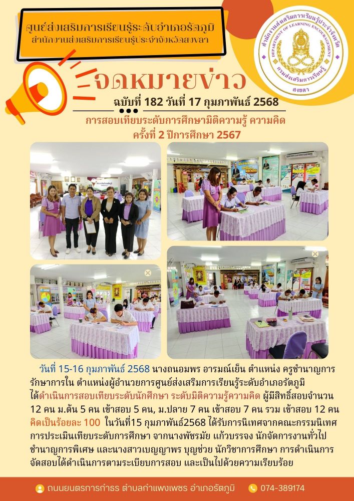 วันที่ 15-16 กุมภาพันธ์ 2568 นางถนอมพร อารมณ์เย็น ตำแหน่ง ครูชำนาญการ รักษาการใน ตำแหน่งผู้อำนวยการศูนย์ส่งเสริมการเรียนรู้ระดับอำเภอรัตภูมิได้ดำเนินการสอบเทียบระดับนักศึกษา ระดับมิติความรู้ความคิด ผู้มีสิทธิ์สอบจำนวน 12 คน ม.ต้น 5 คน เข้าสอบ 5 คน, ม.ปลาย 7 คน เข้าสอบ 7 คน รวม เข้าสอบ 12 คน คิดเป็นร้อยละ 100 ในวันที่15 กุมภาพันธ์2568 ได้รับการนิเทศจากคณะกรรมนิเทศการประเมินเทียบระดับการศึกษา จากนางพัชรมัย แก้วบรรจง นักจัดการงานทั่วไปชำนาญการพิเศษ และนางสาวเบญญาพร บุญช่วย นักวิชาการศึกษา การดำเนินการจัดสอบได้ดำเนินการตามระเบียบการสอบ และเป็นไปด้วยความเรียบร้อย
