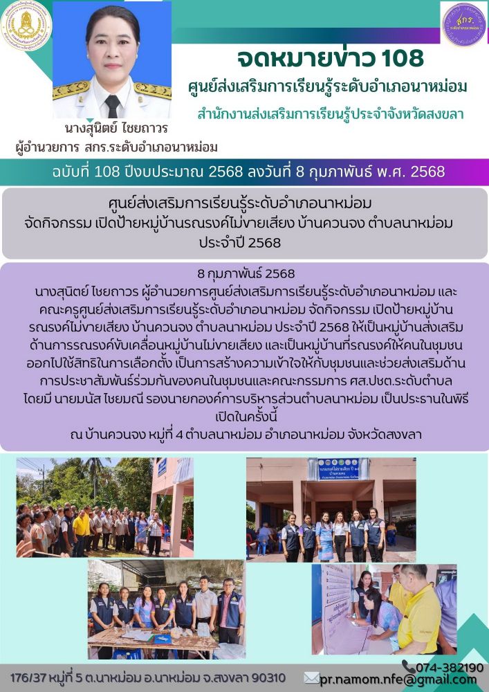 นางสุนิตย์ ไชยถาวร ผู้อำนวยการศูนย์ส่งเสริมการเรียนรู้ระดับอำเภอนาหม่อม เเละคณะครูศูนย์ส่งเสริมการเรียนรู้ระดับอำเภอนาหม่อม จัดกิจกรรม เปิดป้ายหมู่บ้านรณรงค์ไม่ขายเสียง บ้านควนจง ตำบลนาหม่อม ประจำปี 2568 ให้เป็นหมู่บ้านส่งเสริมด้านการรณรงค์ขับเคลื่อนหมู่บ้านไม่ขายเสียง และเป็นหมู่บ้านที่รณรงค์ให้คนในชุมชนออกไปใช้สิทธิในการเลือกตั้ง เป็นการสร้างความเข้าใจให้กับชุมชนและช่วยส่งเสริมด้านการประชาสัมพันธ์ร่วมกันของคนในชุมชนและคณะกรรมการ ศส.ปชต.ระดับตำบล