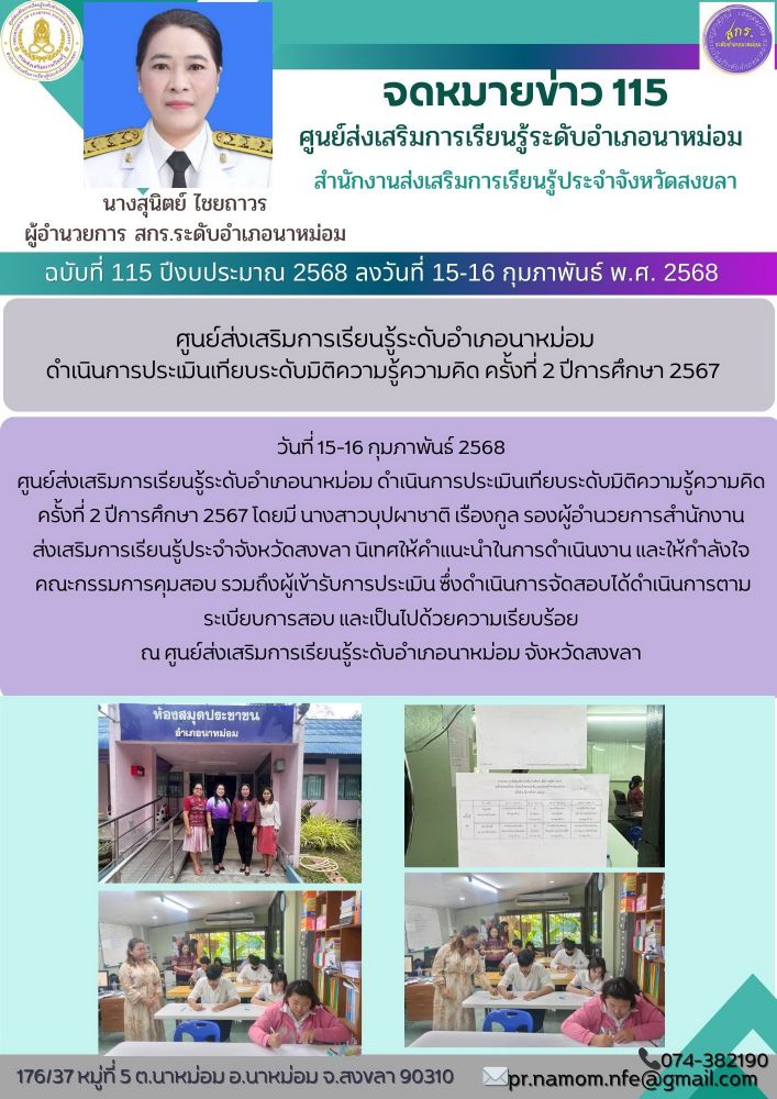 ศูนย์ส่งเสริมการเรียนรู้ระดับอำเภอนาหม่อม ดำเนินการประเมินเทียบระดับมิติความรู้ความคิด ครั้งที่ 2 ปีการศึกษา 2567 โดยมี นางสาวบุปผาชาติ เรืองกูล รองผู้อำนวยการสำนักงานส่งเสริมการเรียนรู้ประจำจังหวัดสงขลา นิเทศให้คำแนะนำในการดำเนินงาน และให้กำลังใจ คณะกรรมการคุมสอบ รวมถึงผู้เข้ารับการประเมิน ซึ่งดำเนินการจัดสอบได้ดำเนินการตามระเบียบการสอบ และเป็นไปด้วยความเรียบร้อย