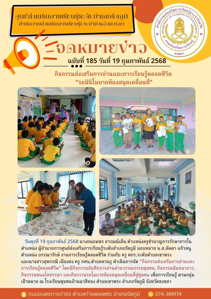 วันพุธที่ 19 กุมภาพันธ์ 2568 นางถนอมพร อารมณ์เย็น ตำแหน่งครูชำนาญการรักษาการในตำแหน่ง ผู้อำนวยการศูนย์ส่งเสริมการเรียนรู้ระดับอำเภอรัตภูมิ มอบหมาย น.ส.ลัดดา แก้วหนู ตำแหน่ง บรรณารักษ์ งานการเรียนรู้ตลอดชีวิต ร่วมกับ ครู ศกร.ระดับตำบลเขาพระและนางสาวสุพรรณี เมืองสง ครู กศน.ตำบลควนรู ดำเนินการจัด “กิจกรรมส่งเสริมการอ่านและการเรียนรู้ตลอดชีวิต” โดยมีกิจกรรมบันทึกการอ่านผ่านวรรณกรรมชุมชน, กิจกรรมนันทนาการ, กิจกรรมขนมโคหรรษา และกิจกรรมรถโมบายห้องสมุดเคลื่อนที่สู่ชุมชน เพื่อการเรียนรู้ ตามกลุ่มเป้าหมาย ณ โรงเรียนชุมชนบ้านนาสีทอง ตำบลเขาพระ อำเภอรัตภูมิ จังหวัดสงขลา