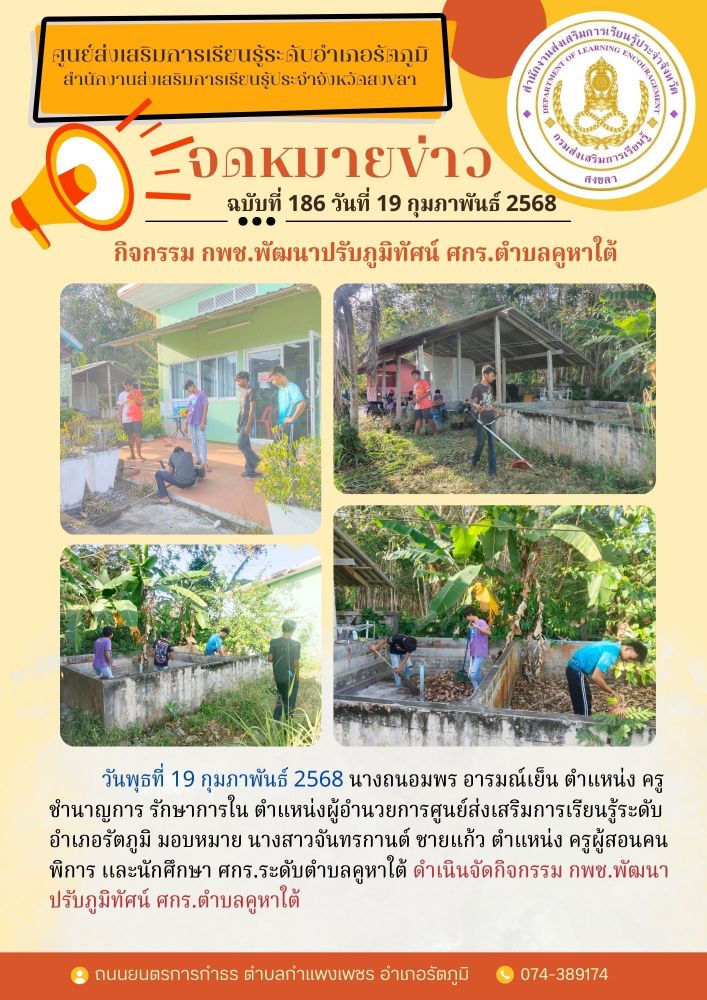 วันพุธที่ 19 กุมภาพันธ์ 2568 นางถนอมพร อารมณ์เย็น ตำแหน่ง ครูชำนาญการ รักษาการใน ตำแหน่งผู้อำนวยการศูนย์ส่งเสริมการเรียนรู้ระดับอำเภอรัตภูมิ มอบหมาย นางสาวจันทรกานต์ ชายแก้ว ตำแหน่ง ครูผู้สอนคนพิการ เเละนักศึกษา ศกร.ระดับตำบลคูหาใต้ ดำเนินจัดกิจกรรม กพช.พัฒนาปรับภูมิทัศน์ ศกร.ตำบลคูหาใต้