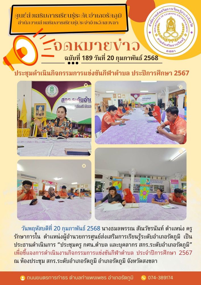 วันพฤหัสบดีที่ 20 กุมภาพันธ์ 2568 นางธมลพรรณ สัณวัชรนันท์ ตำแหน่ง ครูรักษาการใน ตำแหน่งผู้อำนวยการศูนย์ส่งเสริมการเรียนรู้ระดับอำเภอรัตภูมิ เป็นประธานดำเนินการ “ประชุมครู กศน.ตำบล และบุคลากร สกร.ระดับอำเภอรัตภูมิ” เพื่อชี้แจงการดำเนินงานกิจกรรมการแข่งขันกีฬาตำบล ประจำปีการศึกษา 2567 ณ ห้องประชุม สกร.ระดับอำเภอรัตภูมิ อำเภอรัตภูมิ จังหวัดสงขลา