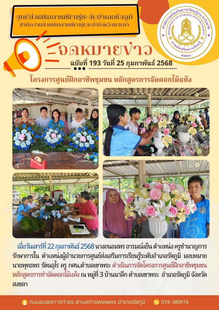 เมื่อวันเสาร์ที่ 22 กุมภาพันธ์ 2568 นางถนอมพร อารมณ์เย็น ตำแหน่ง ครูชำนาญการ รักษาการใน ตำแหน่งผู้อำนวยการศูนย์ส่งเสริมการเรียนรู้ระดับอำเภอรัตภูมิ มอบหมาย นายพุทธพร รัตนอุไร ครู กศน.ตำบลเขาพระ ดำเนินการจัดโครงการศูนย์ฝึกอาชีพชุมชน หลักสูตรการทำจัดดอกไม้แห้ง ณ หมู่ที่ 3 บ้านนาลึก ตำบลเขาพระ อำเภอรัตภูมิ จังหวัดสงขลา