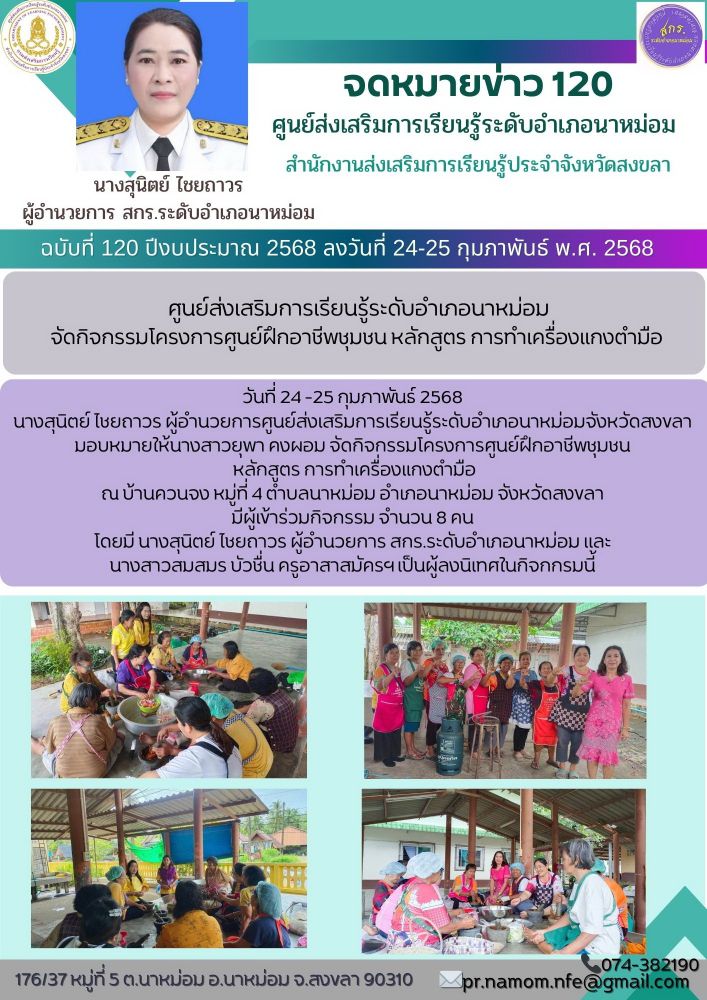 นางสุนิตย์ ไชยถาวร ผู้อำนวยการศูนย์ส่งเสริมการเรียนรู้ระดับอำเภอนาหม่อมจังหวัดสงขลา มอบหมายให้นางสาวยุพา คงผอม จัดกิจกรรมโครงการศูนย์ฝึกอาชีพชุมชน หลักสูตร การทำเครื่องแกงตำมือ