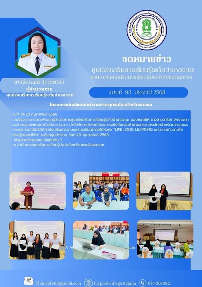 นางจีรวรรณ ปัตตะพัฒน์ ผู้อำนวยการศูนย์ส่งเสริมการเรียนรู้ระดับอำเภอจะนะ มอบหมายให้ นางสาววารียา อัคราเดชานนท์ ครูอาสาฯในสถาบันศึกษาปอเนาะ นำนักศึกษาเข้าร่วมโครงการแข่งขันตอบคำถามสารานุกรมไทยสำหรับเยาวชนและการประกวดคลิปวิดิทัศน์ส่งเสริมการอ่านและการเรียนรู้ภายใต้หัวข้อ “Life Long Learning เพราะเราเกิดมาเพื่อเรียนรู้ตลอดชีวิต“ ระดับกลุ่มอ่าวไทย วันที่ 20 กุมภาพันธ์ 2568