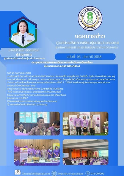 นางจีรวรรณ์ ปัตตะพัฒน์ ผอ.สกร.ระดับอำเภอจะนะ มอบหมายให้ นายมู่หำหมัด บินล่าเต๊ะ ครูชำนาญการพิเศษ และ ครู สกร.ระดับอำเภอจะนะ ว่าที่ ร.ต.ฤทธา ภารา นางสาวกาญจนา ไพบูลย์สวัสดิ์ เข้าร่วมประชุมตรวจราชการและติดตามการดำเนินงานขับเคลื่อนนโยบายของกระทรวงศึกษาธิการ ครั้งที่ 1 / 2568 โดยมีคณะผู้บริหารและบุคลากรสำนักงาน สกร.ประจำจังหวัดสงขลา คณะ