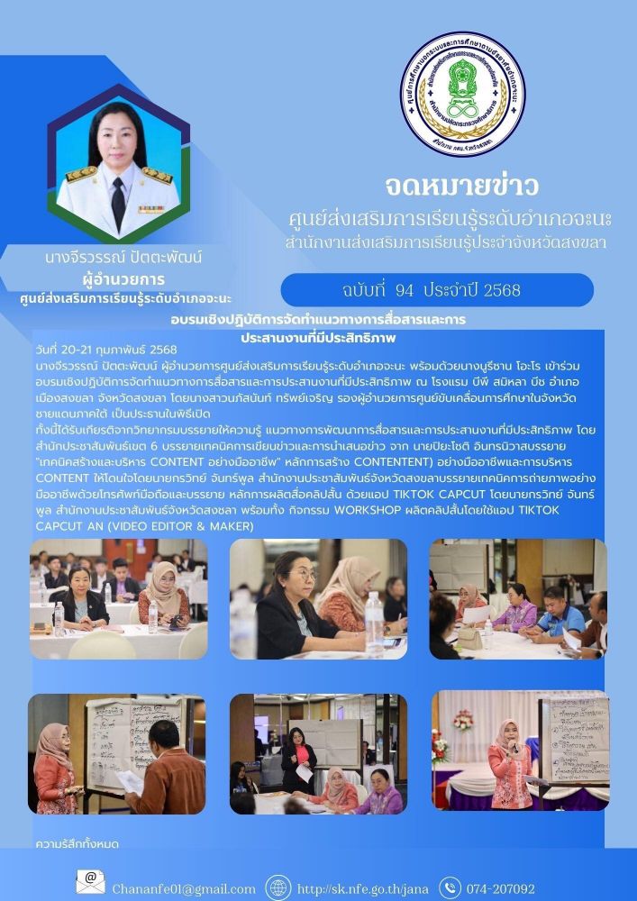 นางจีรวรรณ์ ปัตตะพัฒน์ ผู้อำนวยการศูนย์ส่งเสริมการเรียนรู้ระดับอำเภอจะนะ พร้อมด้วยนางนูรีซาน โอะโร เข้าร่วมอบรมเชิงปฏิบัติการจัดทำแนวทางการสื่อสารและการประสานงานที่มีประสิทธิภาพ ณ โรงแรม บีพี สมิหลา บีช อำเภอเมืองสงขลา จังหวัดสงขลา โดยนางสาวนภัสนันท์ ทรัพย์เจริญ รองผู้อำนวยการศูนย์ขับเคลื่อนการศึกษาในจังหวัดชายแดนภาคใต้ เป็นประธานในพิธีเปิด