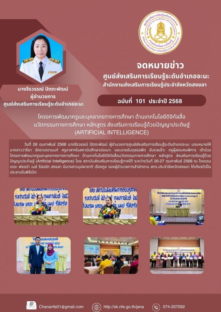 นางจีรวรรณ์ ปัตตะพัฒน์ ผู้อำนวยการศูนย์ส่งเสริมการเรียนรู้ระดับอำเภอจะนะ มอบหมายให้ นางสาววารียา อัคราเดชานนท์ ครูอาสาฯในสถาบันศึกษาปอเนาะ และ นายอับดุลรอฟัด อับดลเล๊าะ ครูผู้สอนคนพิการ เข้าร่วมโครงการพัฒนาครูและบุคลากรทางการศึกษา ด้านเทคโนโลยีดิจิทัลสื่อนวัตกรรมทางการศึกษา หลักสูตร ส่งเสริมการเรียนรู้ด้วยปัญญาประดิษฐ์ (Artificial Intelligence) โดย สถาบันส่งเสริมการเรียนรู้ภาคใต้ ระหว่างวันที่ 26-27 กุมภาพันธ์ 2568 ณ โรงแรม เดอะ ฟลอร่า เมย์ รีสอร์ท สงขลา มีนางสาวบุปผาชาติ เรืองกูล รองผู้อำนวยการสำนักงาน สกร.ประจำจังหวัดสงขลา ให้เกียรติเป็นประธานในพิธีเปิด
