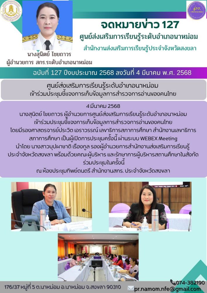 นางสุนิตย์ ไชยถาวร ผู้อำนวยการศูนย์ส่งเสริมการเรียนรู้ระดับอำเภอนาหม่อม เข้าร่วมประชุมชี้แจงการเก็บข้อมูลการสำรวจการอ่านของคนไทย โดยมีรองศาสตรจารย์ประวิต เอราวรรณ์ เลขาธิการสภาการศึกษา สำนักงานเลขาธิการสภาการศึกษา เป็นผู้เปิดการประชุมครั้งนี้ ผ่านระบบ WEBEX Meeting