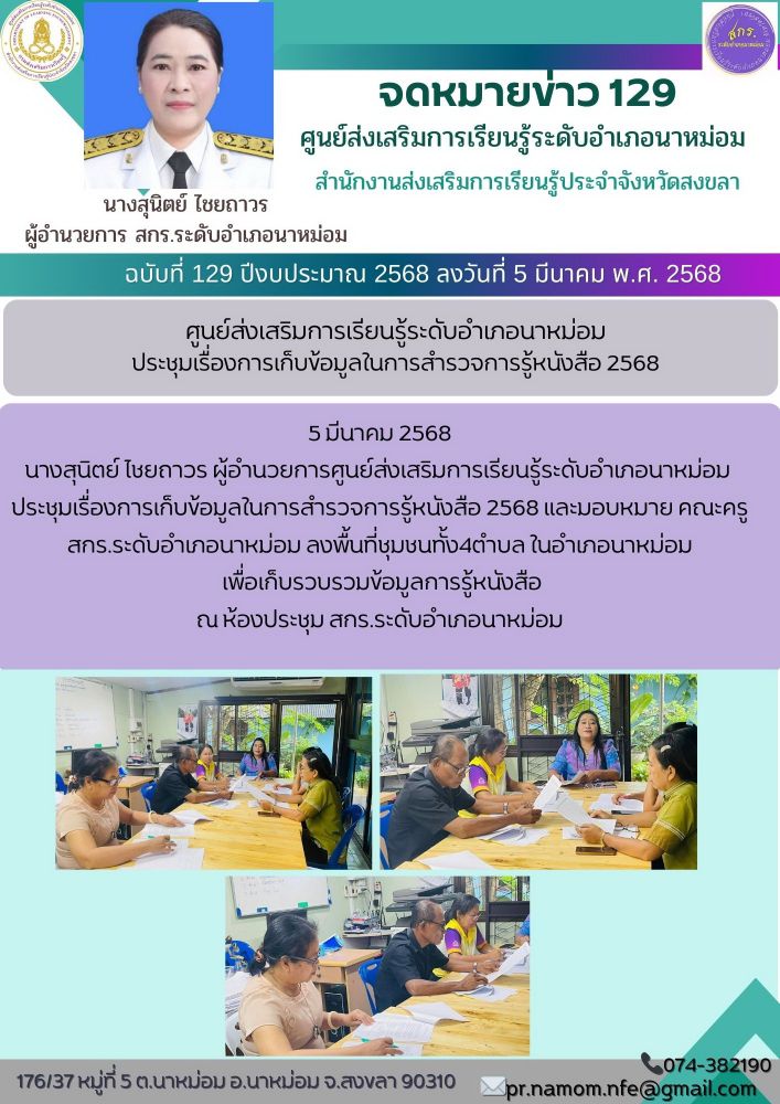 นางสุนิตย์ ไชยถาวร ผู้อำนวยการศูนย์ส่งเสริมการเรียนรู้ระดับอำเภอนาหม่อม ประชุมเรื่องการเก็บข้อมูลในการสำรวจการรู้หนังสือ 2568 และมอบหมาย คณะครู สกร.ระดับอำเภอนาหม่อม ลงพื้นที่ชุมชนทั้ง4ตำบล ในอำเภอนาหม่อม เพื่อเก็บรวบรวมข้อมูลการรู้หนังสือ