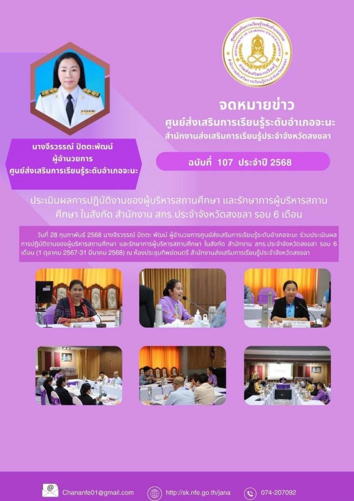 นางจีรวรรณ์ ปัตตะ พัฒน์ ผู้อำนวยการศูนย์ส่งเสริมการเรียนรู้ระดับอำเภอจะนะ ร่วมประเมินผลการปฏิบัติงานของผู้บริหารสถานศึกษา และรักษาการผู้บริหารสถานศึกษา ในสังกัด สำนักงาน สกร.ประจำจังหวัดสงขลา รอบ 6 เดือน (1 ตุลาคม 2567-31 มีนาคม 2568)