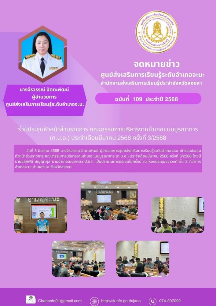นางจีรวรรณ ปัตตะพีฒน์ ผู้อำนวยการศูนย์ส่งเสริมการเรียนรู้ระดับอำเภอจะนะ เข้าร่วมประชุมหัวหน้าส่วนราชการ คณะกรรมการบริหารงานอำเภอแบบบูรณาการ (ก.บ.อ.) ประจำเดือนมีนาคม 2568 ครั้งที่ 3/2568 โดยมีนายซุลกิฟลี สัญญากุล นายอำเภอจะนะ/ผอ.ศป.ปส. เป็นประธานการประชุมในครั้งนี้