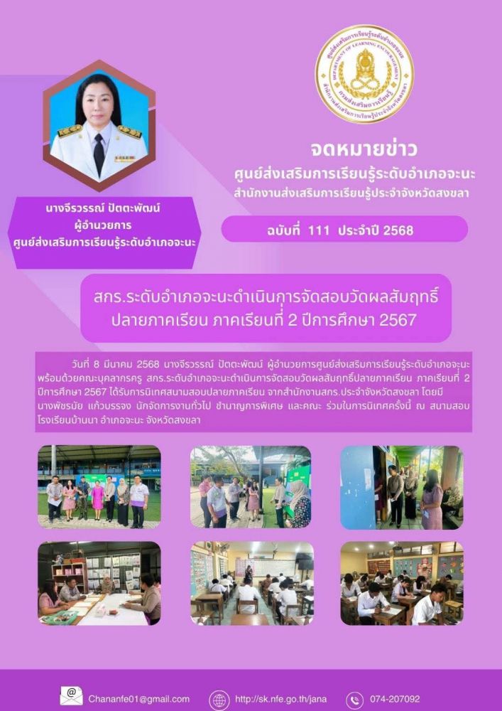 นางจีรวรรณ์ ปัตตะพัฒน์ ผู้อำนวยการศูนย์ส่งเสริมการเรียนรู้ระดับอำเภอจะนะ พร้อมด้วยบุคลากรครู สกร.ระดับอำเภอจะนะดำเนินการจัดสอบวัดผลสัมฤทธิ์ปลายภาคเรียน ภาคเรียนที่ 2 ปีการศึกษา 2567 และได้รับการนิเทศสนามสอบปลายภาคเรียนจากสำนักงานสกร.ประจำจังหวัดสงขลา โดยนางพัชรมัย แก้วบรรจง นักจัดการงานทั่วไปชำนาญการพิเศษและคณะ ร่วมนิเทศ