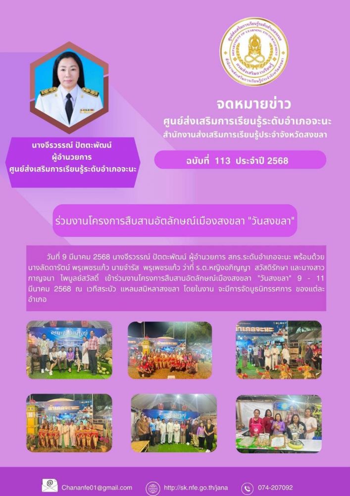 นางจีรวรรณ์ ปัตตะพัฒน์ ผู้อำนวยการ สกร.ระดับอำเภอจะนะ พร้อมด้วย นางลัดดารัตน์ พรุเพชรแก้ว นายจำรัส พรุเพชรแก้ว ว่าที่ ร.ต.หญิงอภิญญา สวัสดิรักษาและนางสาวกาญจนา ไพบูลย์สวัสดิ์ เข้าร่วมงานโครงการสืบสานอัตลักษณ์เมืองสงขลา "วันสงขลา" 9 - 11 มีนาคม 2568