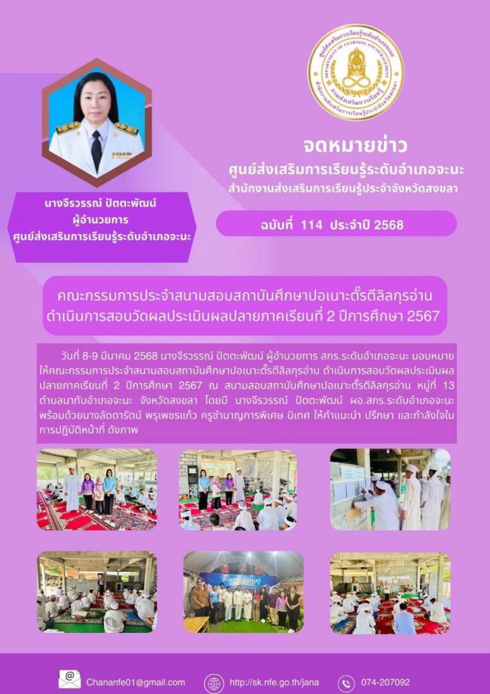 นางจีรวรรณ์ ปัตตะพัฒน์ ผู้อำนวยการศูนย์ส่งเสริมการเรียนรู้ระดับอำเภอจะนะ มอบหมายให้คณะกรรมการประจำสนามสอบสถาบันศึกษาปอเนาะตั๊รตีลิลกุรอ่าน ดำเนินการสอบวัดผลประเมินผลปลายภาคเรียนที่ 2 ปีการศึกษา 2567