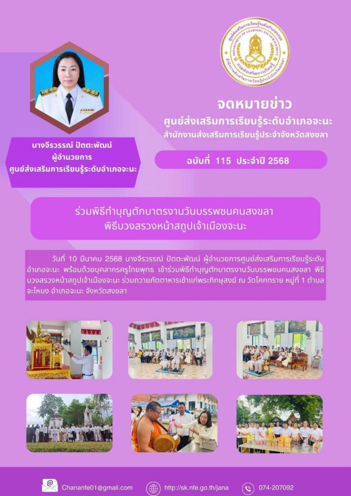 นางจีรวรรณ์ ปัตตะพัฒน์ ผู้อำนวยการศูนย์ส่งเสริมการเรียนรู้ระดับอำเภอจะนะ พร้อมด้วยบุคลากรครูไทยพุทธ ร่วมพิธีทำบุญตักบาตรงานวันบรรพชนคนสงขลา พิธีบวงสรวงหน้าสถูปเจ้าเมืองจะนะ ร่วมถวายภัตตาหารเช้าแก่พระภิกษุสงฆ์