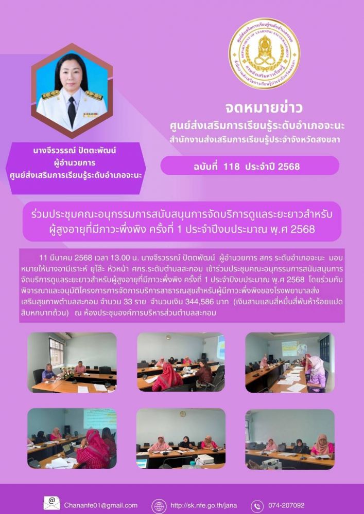 11 มีนาคม 2568 เวลา 13.00 น. นางจีรวรรณ์ ปัตตพัฒน์ ผู้อำนวยการ สกร ระดับอำเภอจะนะ มอบหมายให้นางอามีเราะห์ ยุโส๊ะ หัวหน้า ศกร.ระดับตำบลสะกอม เข้าร่วมประชุ มคณะอนุกรรมการสนับสนุนการจัดบริการดูแลระยะยาวสำหรับผู้สูงอายุที่มีภาวะพึ่งพิง ครั้งที่ 1 ประจำปีงบประมาณ พฺ.ศ 2568 โดยร่วมกันพิจารณาและอนุมัติโครงการการจัดการบริการสาธารณสุขสำหรับผู้มีภาวะพึ่งพิงของโรงพยาบาลส่งเสริมสุขภาพตำบลสะกอม จำนวน 33 ราย จำนวนเงิน 344,586 บาท (เงินสามแสนสี่หมื่นสี่พันห้าร้อยแปดสิบหกบาทถ้วน) ณ ห้องประชุมองค์การบริหารส่วนตำบลสะกอม