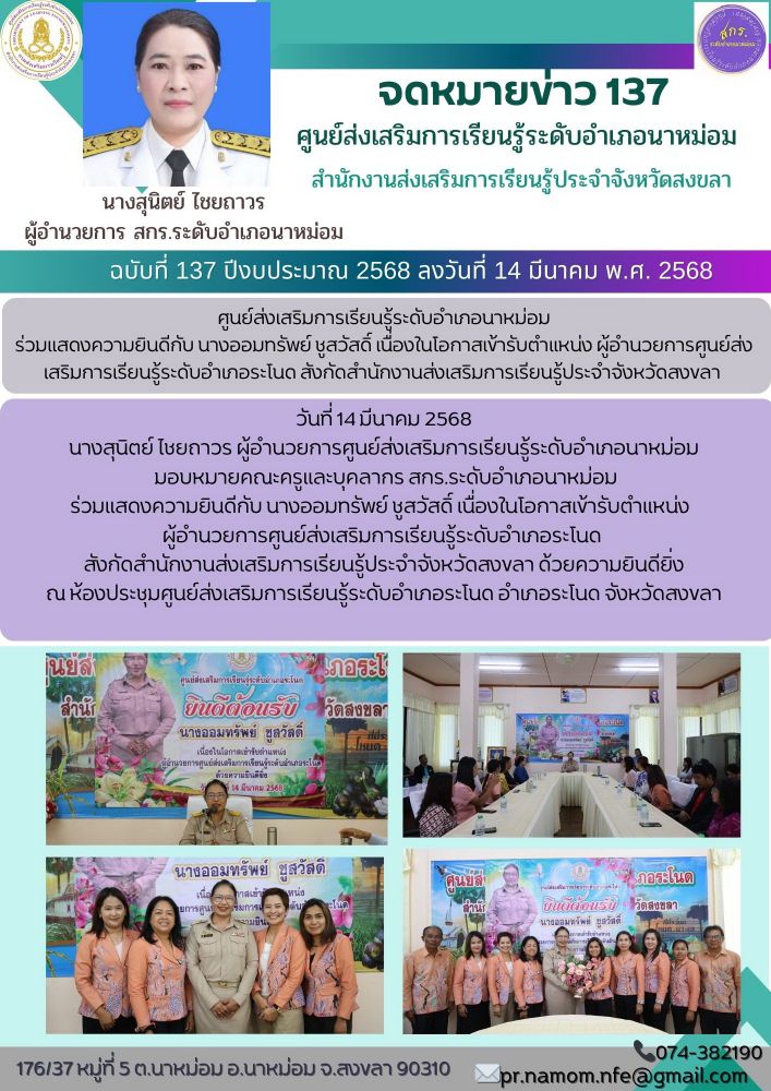 นางสุนิตย์ ไชยถาวร ผู้อำนวยการศูนย์ส่งเสริมการเรียนรู้ระดับอำเภอนาหม่อม มอบหมาย นางสาวสุภารัตน์ พรมชาติ บรรณารักษ์ปฏิบัติการ ร่วมประชุมหารือแนวทางการจัดกิจกรรม “วันรักการอ่าน” ประจำปี พ.ศ. 2568 เพื่อเทิดพระเกียรติ สมเด็จพระกนิษฐาธิราชเจ้า กรมสมเด็จพระเทพรัตนราชสุดาฯ สยามบรมราชกุมารี