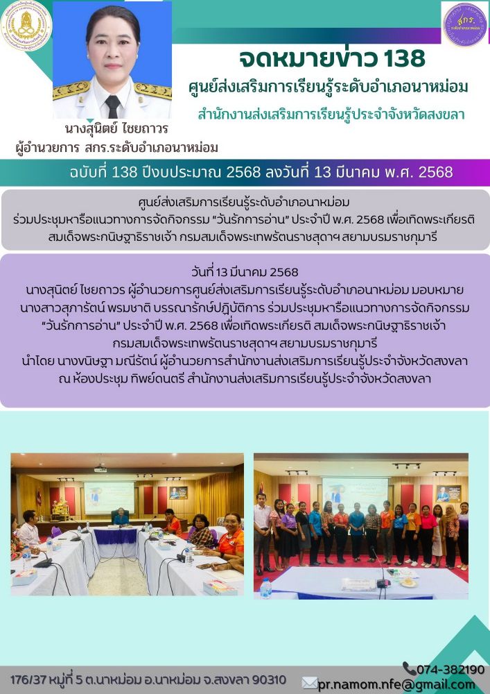 นางสุนิตย์ ไชยถาวร ผู้อำนวยการศูนย์ส่งเสริมการเรียนรู้ระดับอำเภอนาหม่อม มอบหมาย นางสาวสุภารัตน์ พรมชาติ บรรณารักษ์ปฏิบัติการ ร่วมประชุมหารือแนวทางการจัดกิจกรรม “วันรักการอ่าน” ประจำปี พ.ศ. 2568 เพื่อเทิดพระเกียรติ สมเด็จพระกนิษฐาธิราชเจ้า กรมสมเด็จพระเทพรัตนราชสุดาฯ สยามบรมราชกุมารี