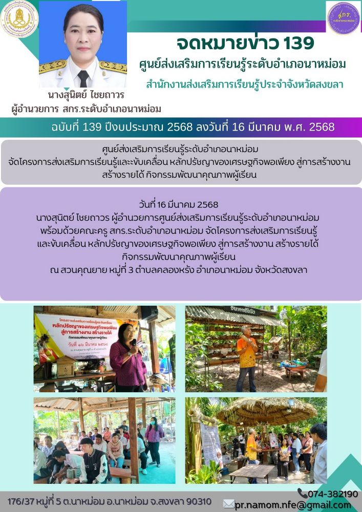 นางสุนิตย์ ไชยถาวร ผู้อำนวยการศูนย์ส่งเสริมการเรียนรู้ระดับอำเภอนาหม่อม พร้อมด้วยคณะครู สกร.ระดับอำเภอนาหม่อม จัดโครงการส่งเสริมการเรียนรู้และะขับเคลื่อน หลักปรัชญาของเศรษฐกิจพอเพียง สู่การสร้างงาน สร้างรายได้ กิจกรรมพัฒนาคุณภาพผู้เรียน