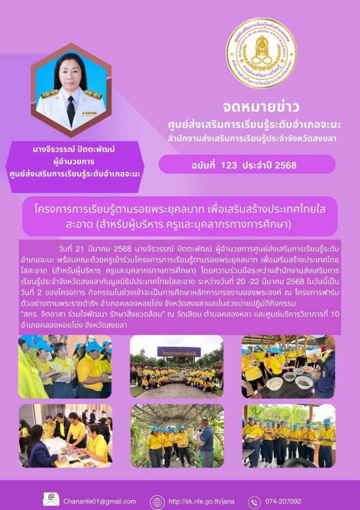นางจีรวรรณ์ ปัตตะพัฒน์ ผู้อำนวยการศูนย์ส่งเสริมการเรียนรู้ระดับอำเภอจะนะ พร้อมคณะด้วยครู เข้าร่วมโครงการการเรียนรู้ตามรอยพระยุคลบาท เพื่อเสริมสร้างประเทศไทยใสสะอาด (สำหรับผู้บริหาร ครูและบุคลากรทางการศึกษา)