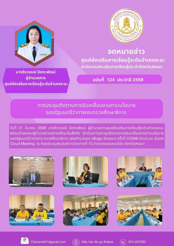 นางจีรวรรณ์ ปัตตะพัฒน์ ผู้อำนวยการศูนย์ส่งเสริมการเรียนรู้ระดับอำเภอจะนะ พร้อมด้วยคณะผู้อำนวยการสถานศึกษาในสังกัด เข้าร่วมการประชุมติดตามการขับเคลื่อนงานตามนโยบายของรัฐมนตรีว่าการกระทรวงศึกษาธิการ (พลตำรวจเอก เพิ่มพูน ชิดชอบ) ครั้งที่ 2/2568 ผ่านระบบ Zoom Cloud Meeting
